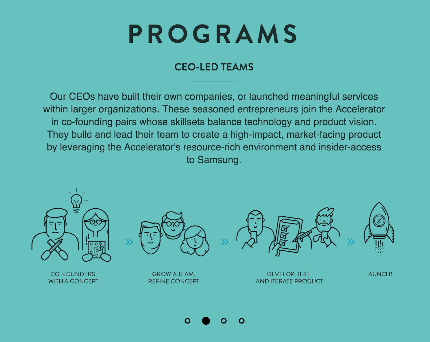 The Accelerator is part of the Samsung Global Innovation Center, which is dedicated to enabling entrepreneurs to thrive in all stages by providing access to Samsung resources, decision-makers, product roadmap, and the world’s largest platforms for distribution.